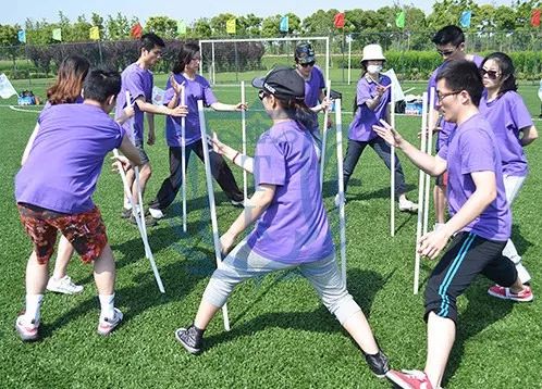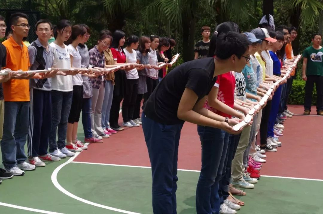 玩法简介:整个团队每个队员手拿一根半圆形的球槽,将球连续传动(滚动)到下一个队员的球槽中,并迅速地排列到队伍的末端继续传送前方队员传来的球,在规定的距离内,用时最短一组获胜。