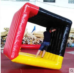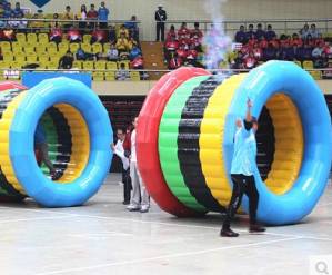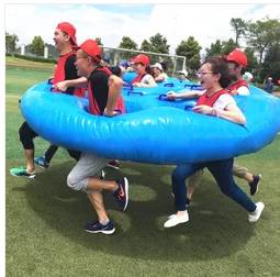 玩法简介:每队5人,比赛开始前,参赛人员站到器材内,裁判发令后各队人员迅速抬起道具往前移动,赛程50米。最先到达终点者为胜。