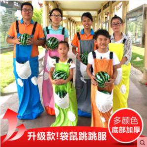 玩法简介:起点到终点的距离设置为*米;每组队员对分为两批,一半在起点,一半在终点,发给每组起点人员一个袋子;比赛开始后,第一个人必需迅速的把袋子套在腿上,然后提起袋子,像袋鼠一样跳向终点的队友;到达终点后,队友立即接过袋子,并以同样的方式跳回起点,这样来回跳,直到所有队员都做过一次袋鼠为止;用时最短一组获胜。