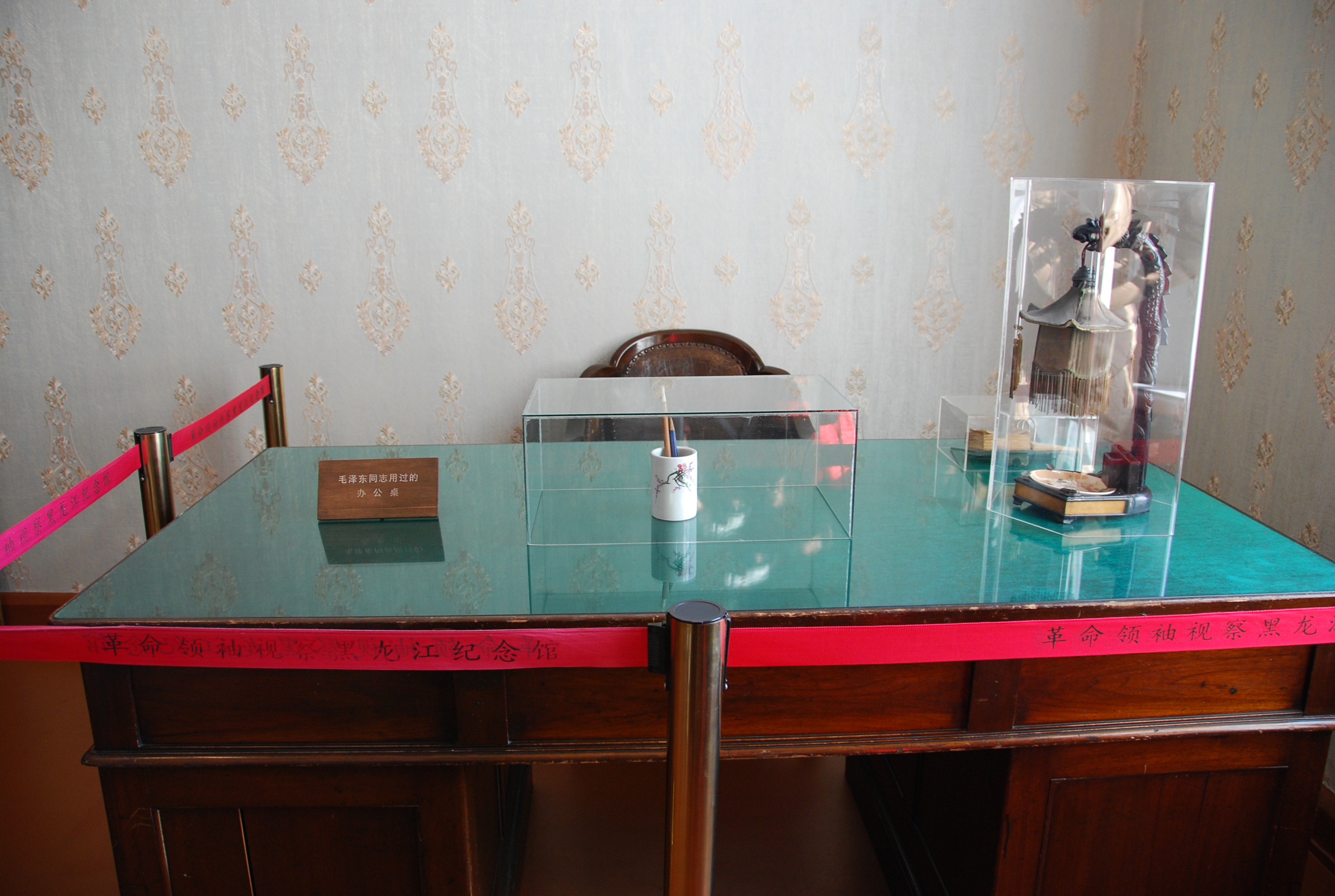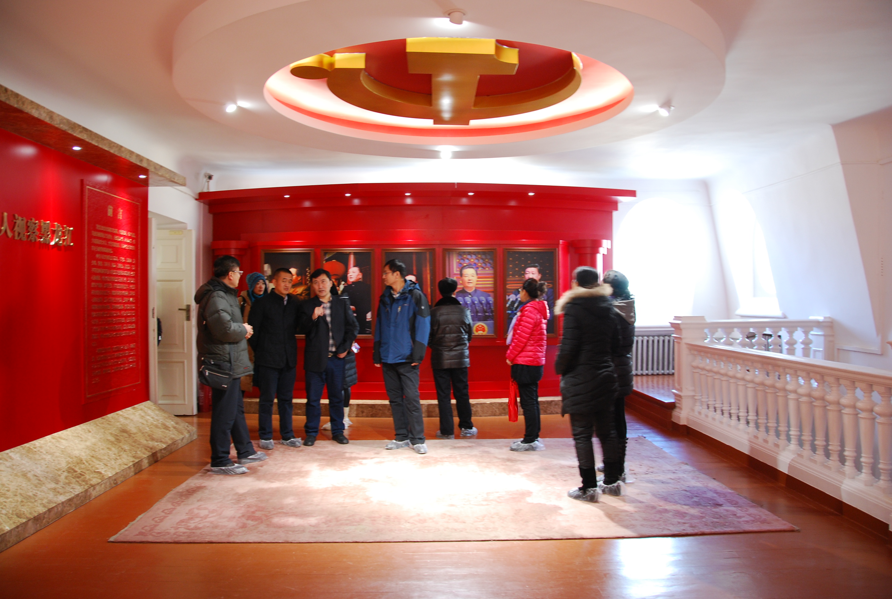 第二站参观革命领袖视察黑龙江纪念馆,纪念馆位于哈尔滨市南岗区颐园街1号,是新中国成立以来,以毛泽东主席为首的,包括周恩来、刘少奇、朱德等老一辈无产阶级革命家文物展出;以毛泽东、邓小平、江泽民、胡锦涛、习近平为核心的五代领导莅临黑龙江视察及工作场景再现,毛主席当年亲笔为省委、市委的题词“不要沾染官僚主义”、“学习”、“奋斗”、‘发展生产”、“学习马列主义”等寓意至今深刻;习近平总书记在黑龙江深入林区、视察科技大厦、亲自农业一线指导,号召全省人民永远奋斗,为龙江可持续发展及经济转型指引方向和道路,并提出了“绿水青山就是金山银山”等重要论断。