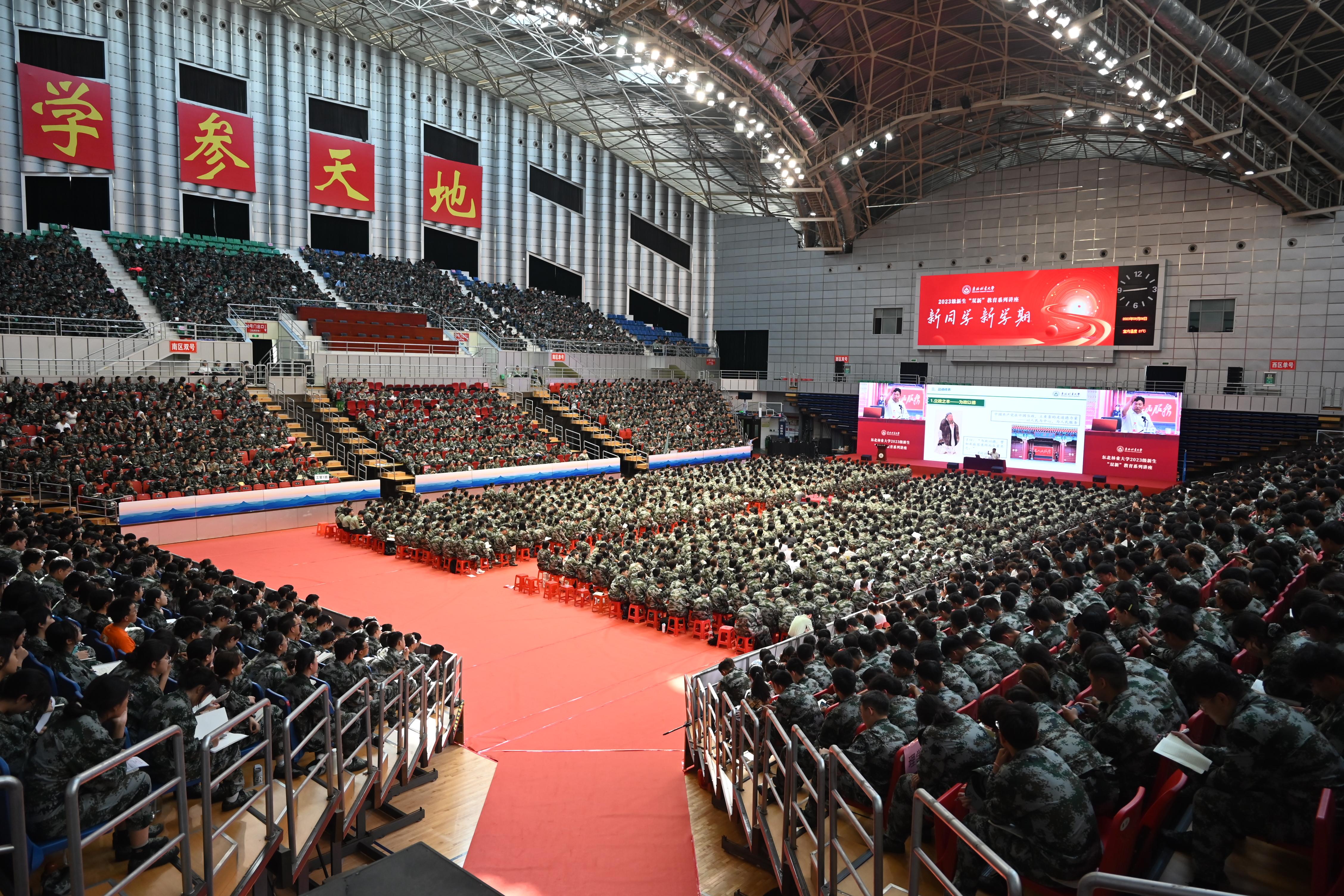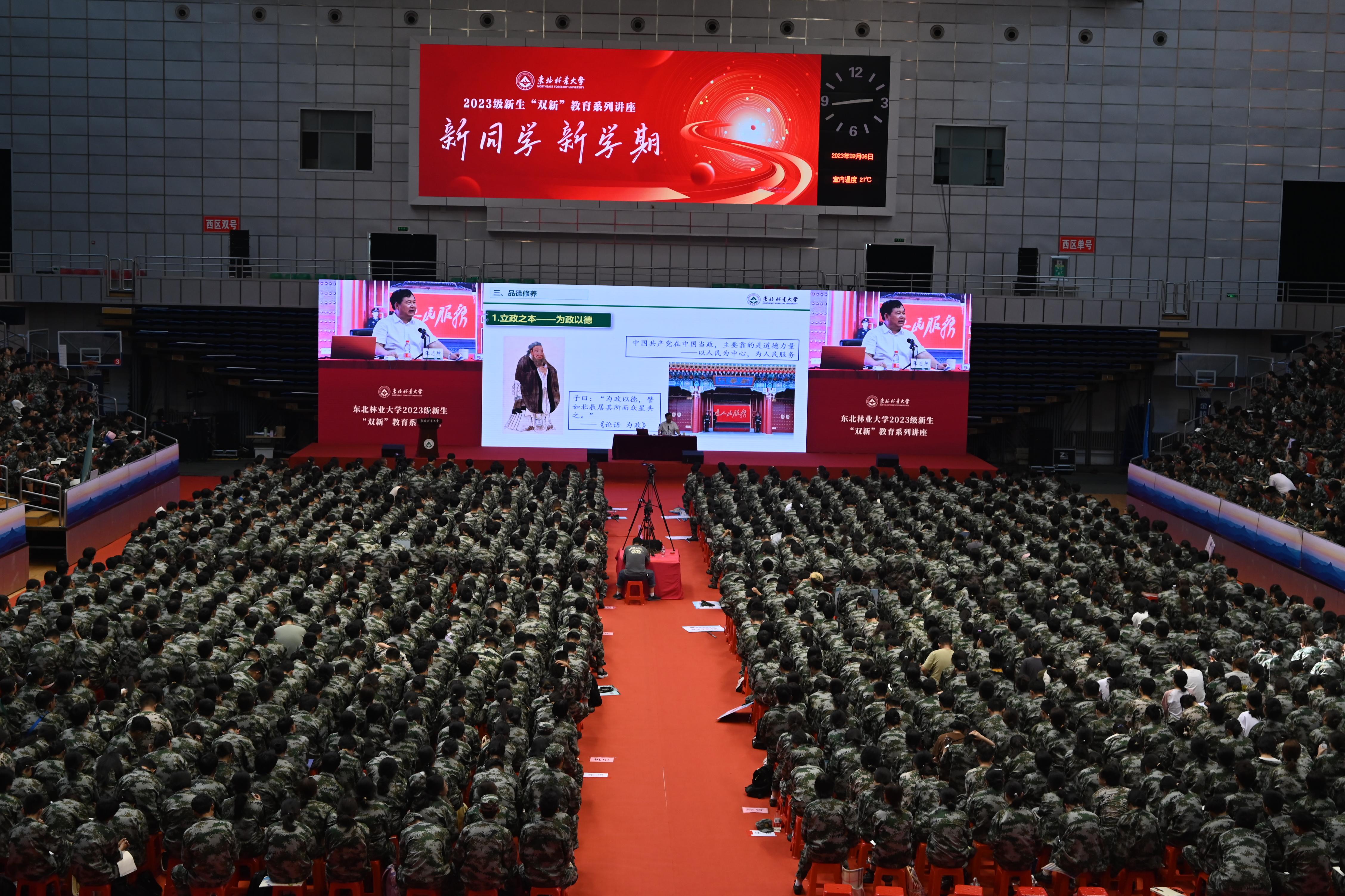2023年9月6-7日,东北林业大学2023级新生“双新”教育系列讲座在体育馆如期举行。本次系列讲座共分为六大主题,分别是党委书记张志坤的以《理想 信念 爱国》为主题的讲座、校长宋文龙的以《校情 校史》为主题的讲座、哈尔滨市传染病院副主任医师由伟臣的以《关爱生命 预防艾滋》为主题的讲座、大学生心理健康发展指导中心主任钱淑红的以《大学生活 从“心”开始》为主题的讲座,香坊分局反诈中心民警尹衍波的以《预防电信诈骗 打击网络犯罪》为主题的讲座、东北林业大学关工委常务副主任原东北林业大学副书记陈文斌教授的以《东林精神谱系》为主题的讲座,会上大家同唱东林校歌,学习东林历史。